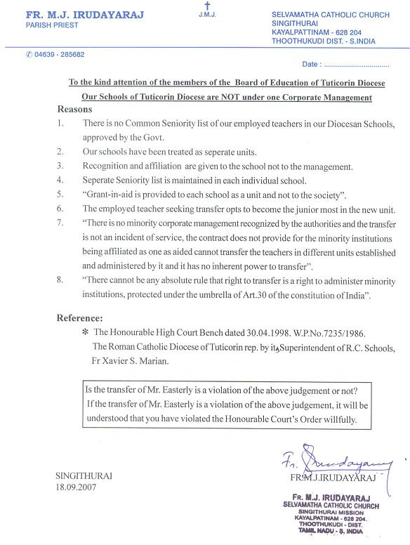 Previous Image Next Image Fr. M.J. Irudhayaraj’s letter Fr. Irudhayaraj seeks justice from the board for education in Tuticroin Diocese
